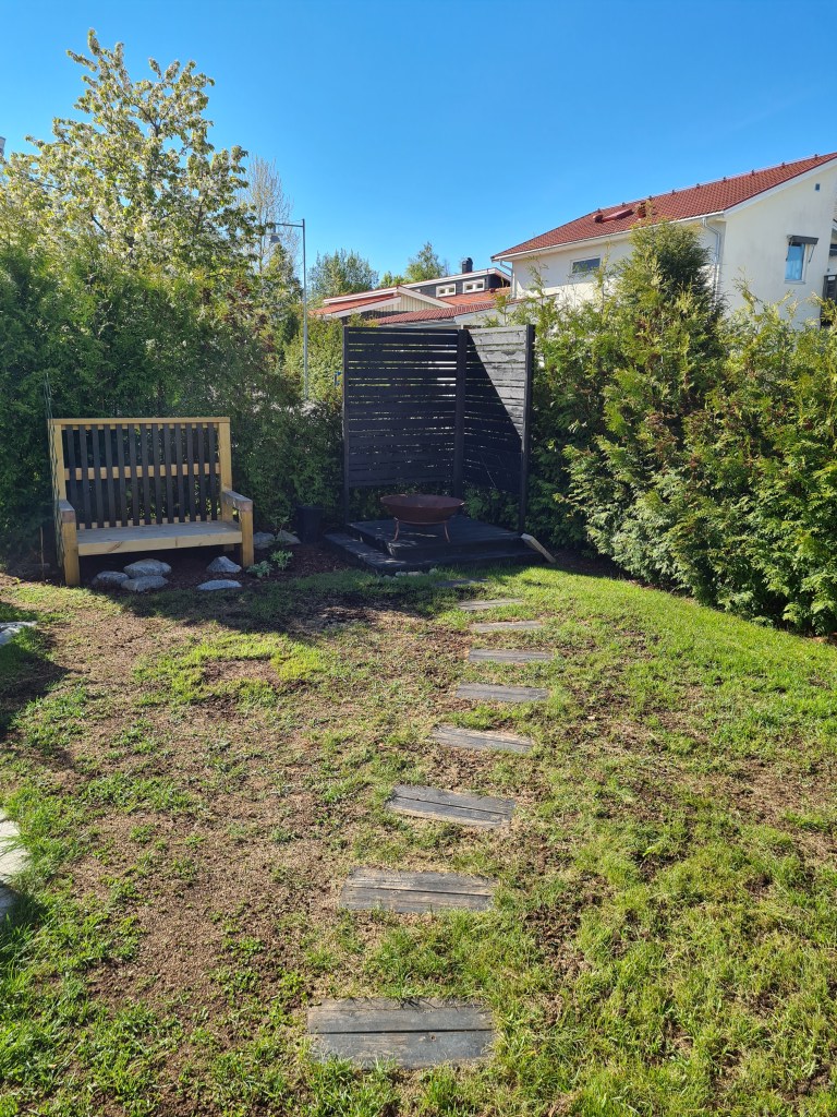 från början var tanken att vi skulle hålla till i en helt annan trädgård, en större och mer luftig trädgård än vår egen. Tyvärr såg vädret inte alls ut att vara med oss i början av veckan, vi blev tvungna att planera om. Så istället valde vi att flytta hem vernissagen, tömma hela altanen (som har tak över sig) med möbler och slå upp ett partytält för att göra ytan större. Däremot hade jag inte riktigt huvudet med mig när vi bestämde oss för att tänka om. Söndagen innan vernissagen toppdressade vi gräsmattan som fått stora frysskador från vintern. Kanske inte den bästa iden att ha folk som går på gräset då, men what the… blir det ingen gräsväxt så gör vi bara om arbetet. Det var helt klart värt det från vår sida.