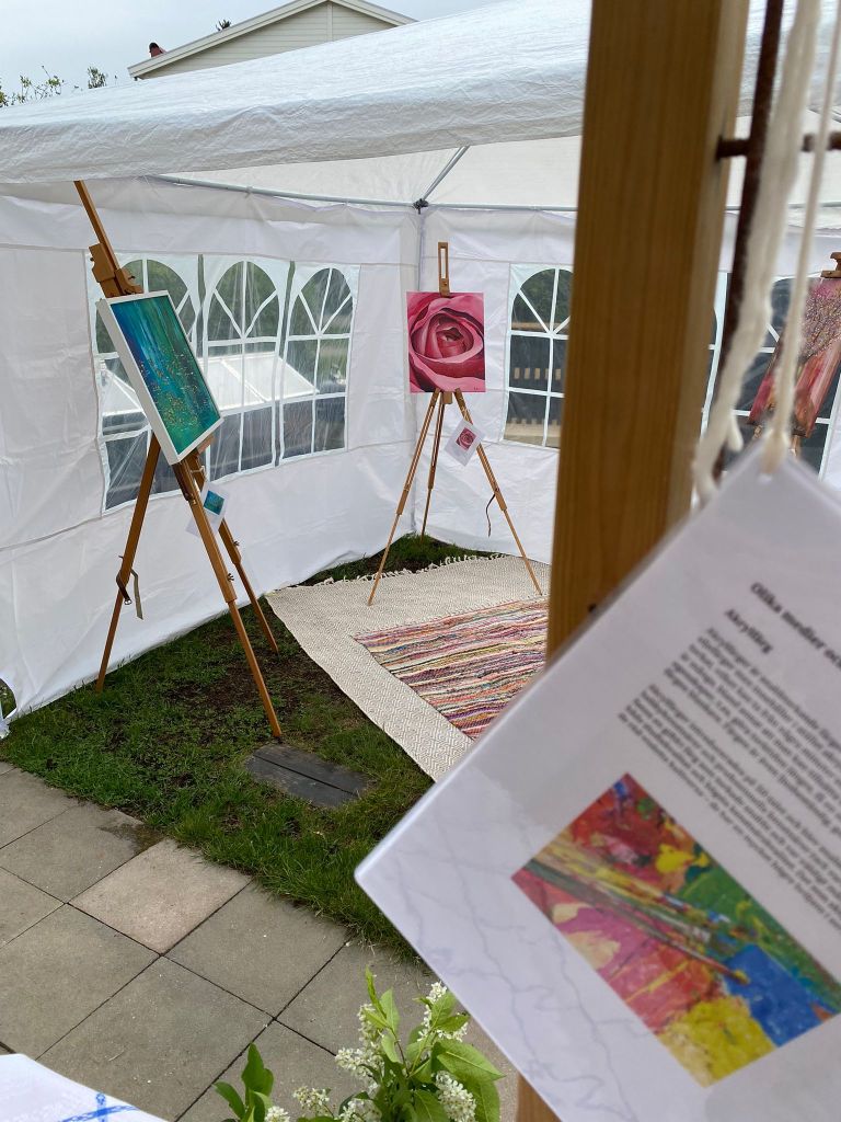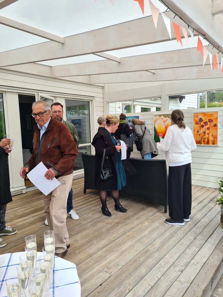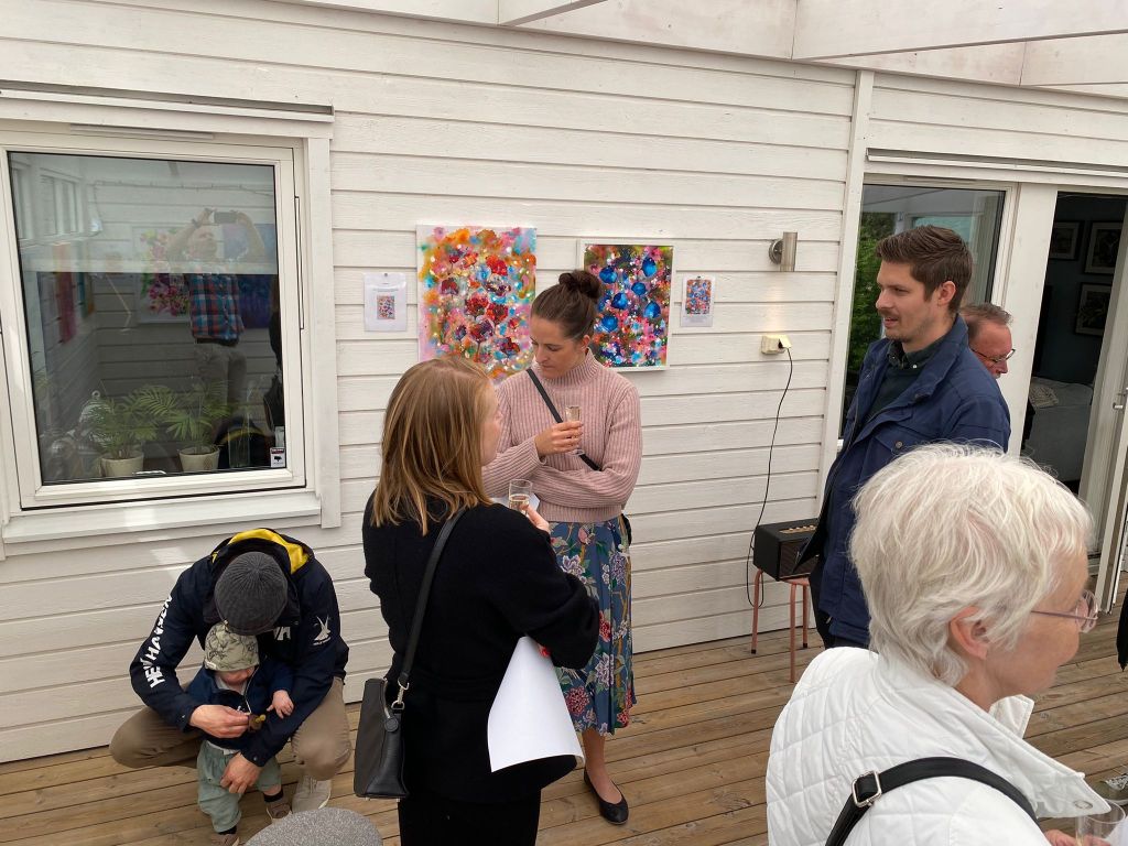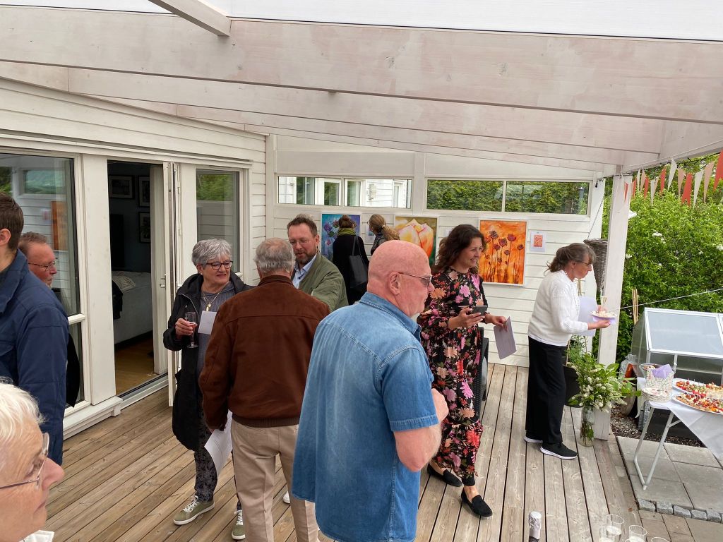 Det blev väldigt lyckat och fördelen med altanen var väggarna där målningarna lätt kunde hängas upp. Och vädret blev bra ändå, till och med lite solig trots allt.