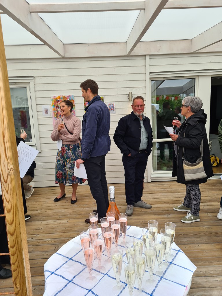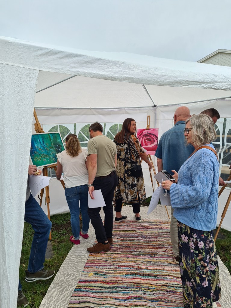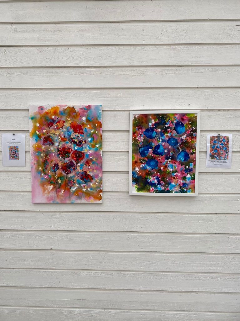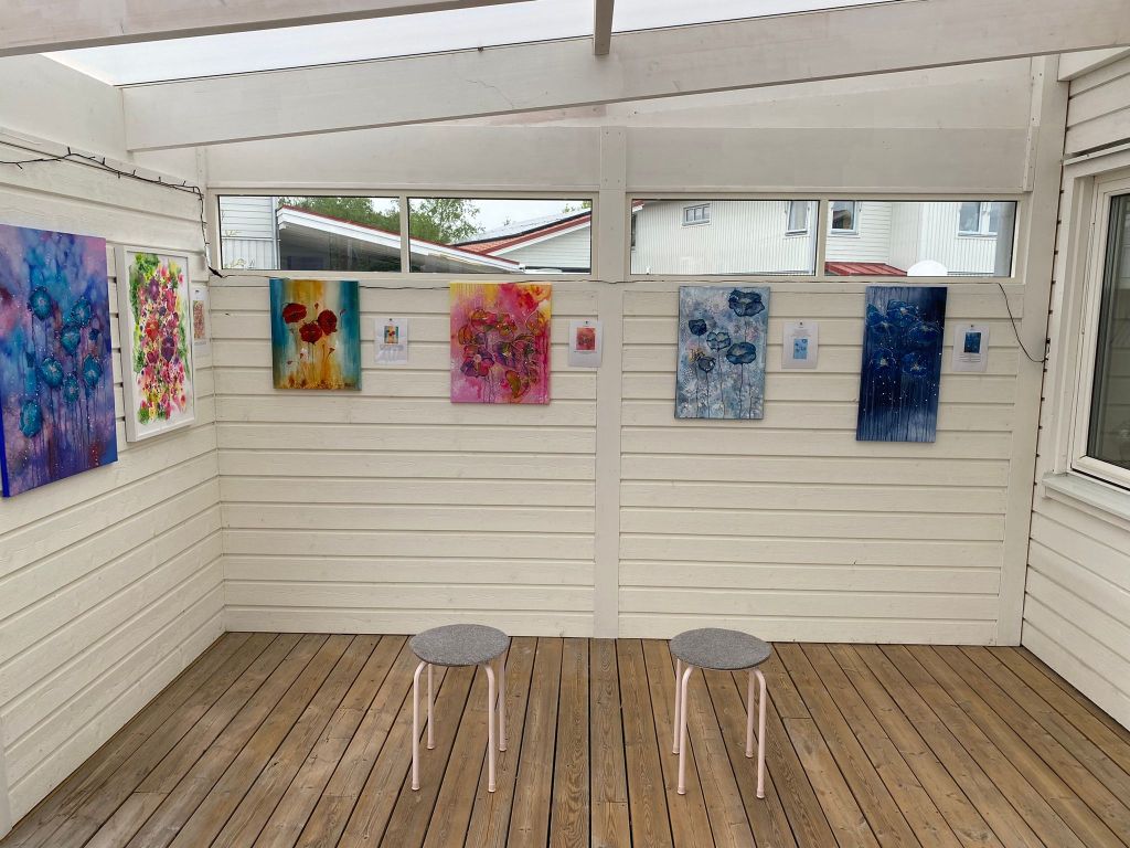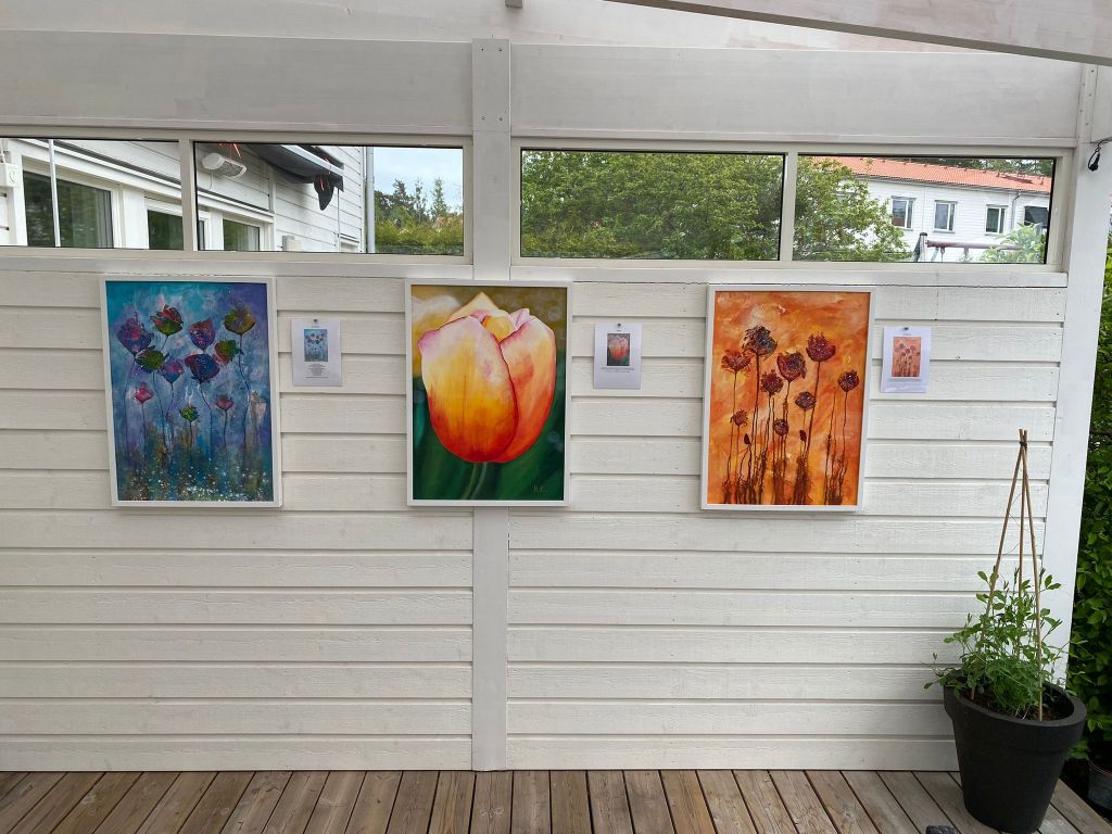 Det blev väldigt lyckat och fördelen med altanen var väggarna där målningarna lätt kunde hängas upp. Och vädret blev bra ändå, till och med lite solig trots allt.