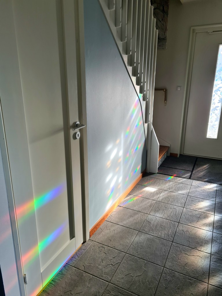 I vår hall har vi ett insynsskydd för den smala fönsterdelen på vår ytterdörr. När kvällssolen ligger på fungerar skyddet som ett prisma så får vi regnbågens alla färger in i vår hall, det är så vackert.