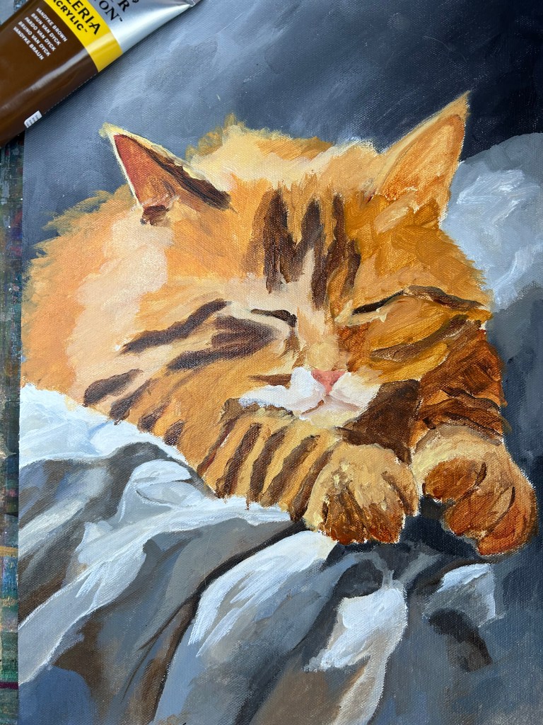 Kattprojektet jag berättade om i förra veckan fortgår. Utmaningen ligger i att få fram pälsens textur på ett realistiskt sätt men ändå med syfte att vara abstrakt, det ska se mjukt och fluffigt ut med mjuka penseldrag och undvika allt för många småstrån. Jag har lagt en grund nu och håller på med ytterligare grundskicket med att tillsätta olika nyanser av färger för att skapa djup och dimension i bilden samt jobbar med stor pensel för att skapa liv och rörelse. Det gäller att få färgerna av ljust och mörkt att smälta samma på ett organiskt sätt för att efterlikna rörelsen i bilden. Som sagt jag har mappat ut färgerna nu så det blir att fortsätta på att jobba för att få mjuka övergångar.